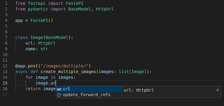 예를 들어 Image 모델 안에 url 필드를 str 대신 Pydantic의 HttpUrl로 선언할 수 있습니다:
