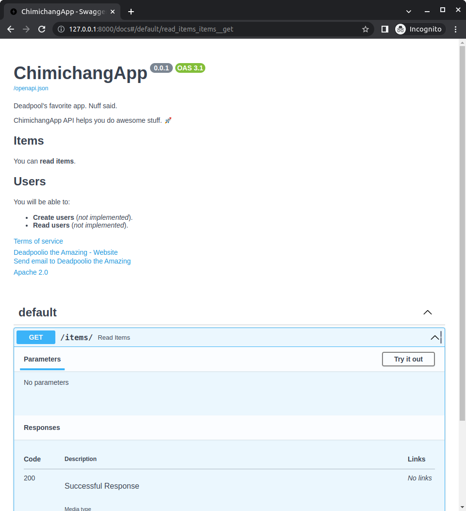 /docs에서 제공됩니다.docs_url매개변수로 URL을 설정할 수 있습니다.docs_url=None으로 설정하여 비활성화할 수 있습니다.
